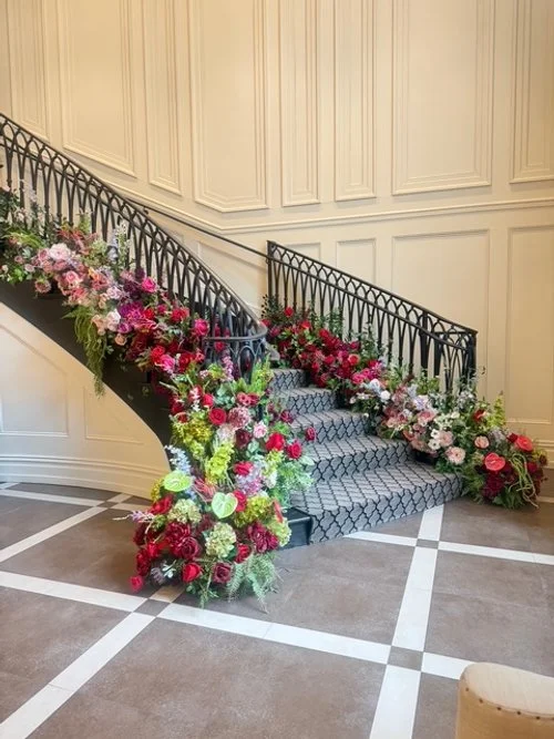 A dramatic palette of crimson, garnet, and deep berry, layered with blush, mauve, and soft lilac for contrast. Bold clusters of roses, ranunculus, and textured botanicals create sculptural movement along staircases and mantels. Lush greenery adds depth, grounding the saturated tones and amplifying the dimensional, garden-meets-editorial design.