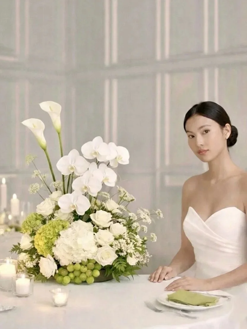 A modern palette of moss green tones and creamy whites, designed with tonal layering for sharp visual depth. Sculptural botanicals and cascading amaranth contrasting through fresh greens, creating clean contrast and a refined contemporary edge. Fluid foliage and structured forms work together to shape a monochromatic look that feels sleek, fresh, and effortlessly elevated.